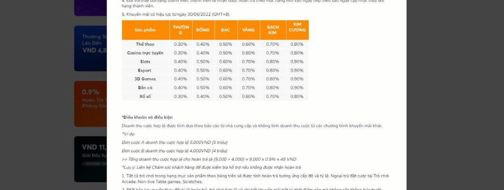 - Một số trò chơi đặc thù như Arcade, Scratches, Non-live Table Games sẽ không được tính vào chính sách hoàn trả.